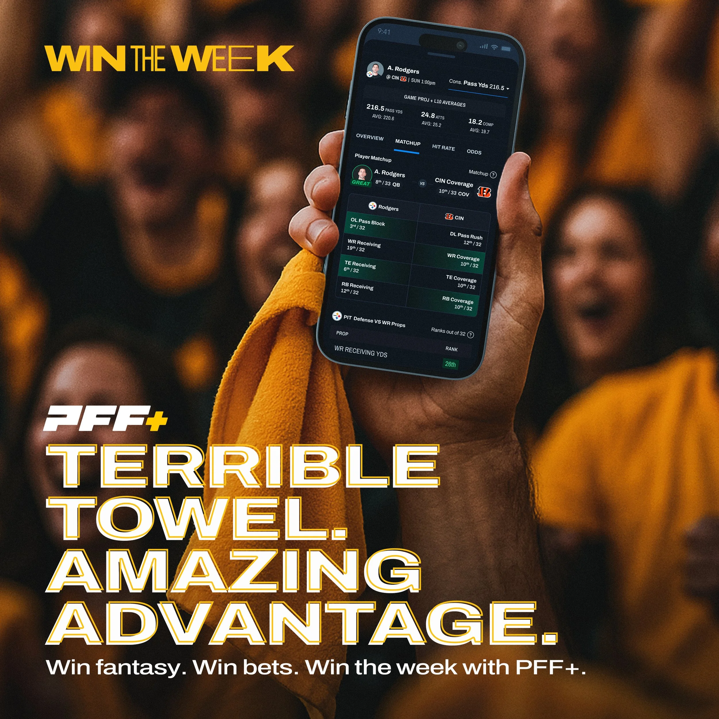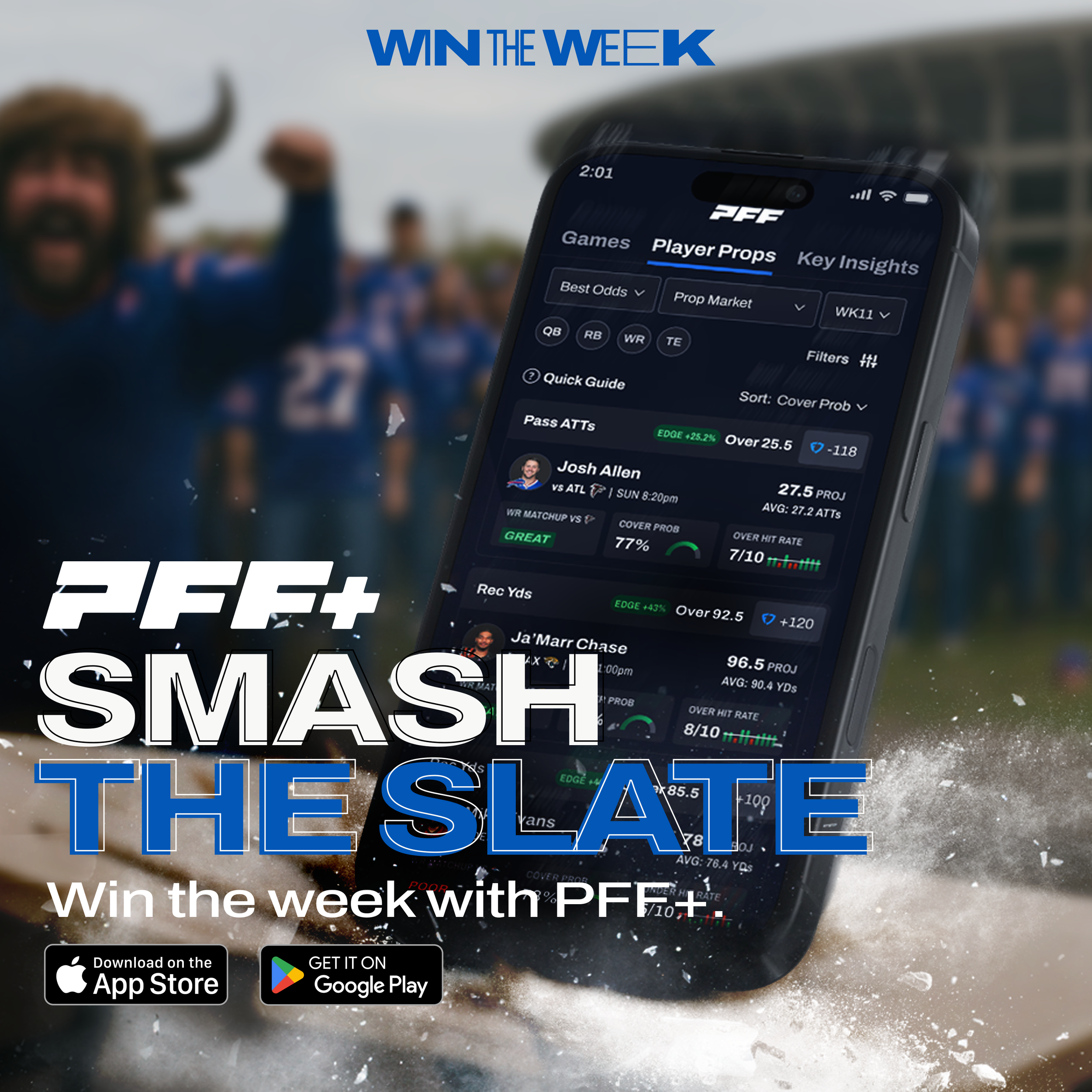 As part of the PFF Win The Week campaign, we created a series of digital ads using known fanbases to drive PFF app downloads. We targeted those interested in both fantasy football and player prop betting.